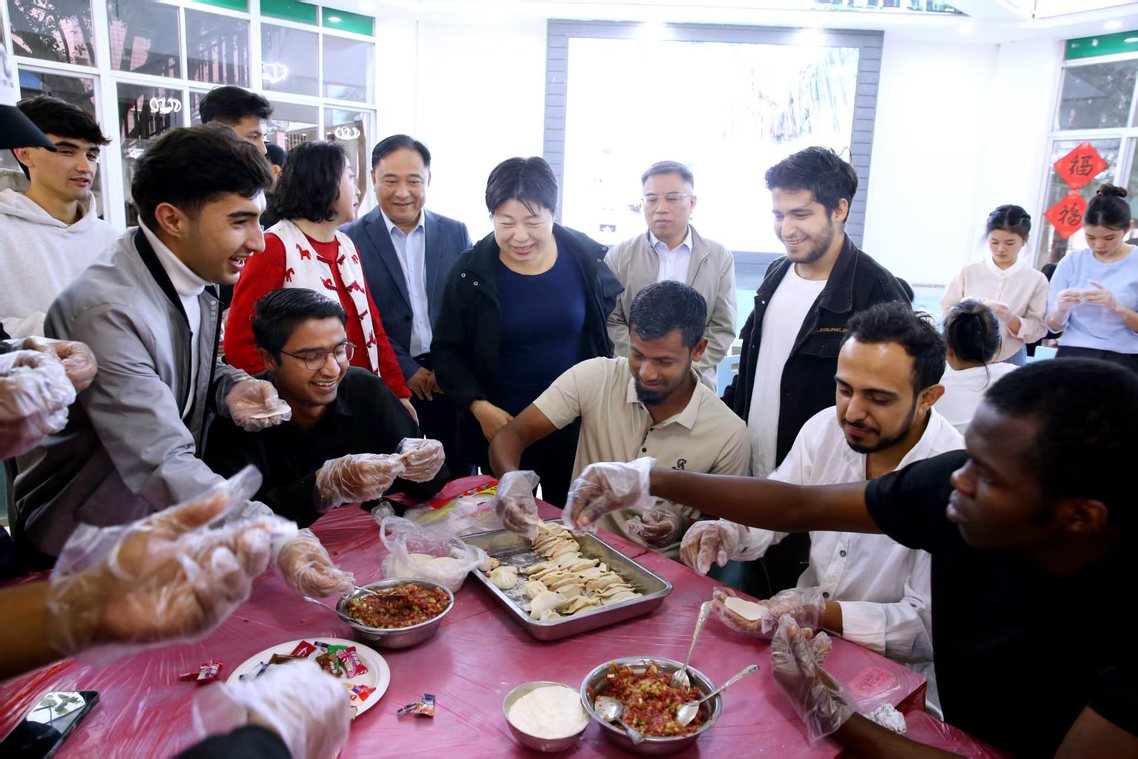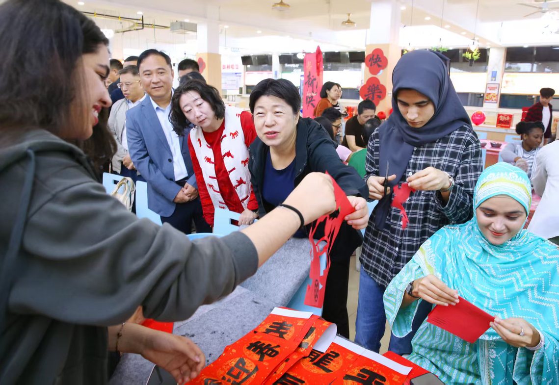 学校党委书记许玫和校党委常委、统战部部长邓志斌一行也来到食堂,亲切慰问留校留学生,向大家致以新春祝福。