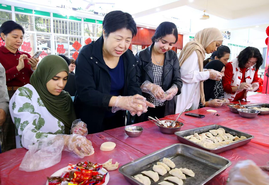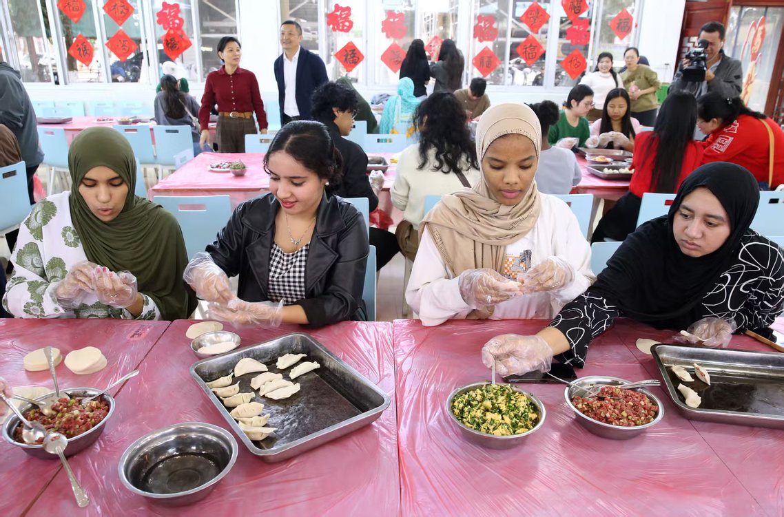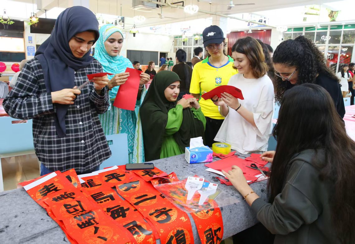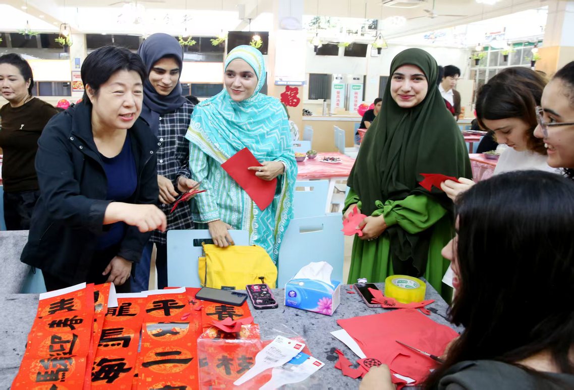 留学生们在老师指导下有模有样地包起饺子,形态各异的作品摆满托盘,欢声笑语不断。大家还体验了写“福”字、剪窗花等传统文化项目,并将作品装饰在餐厅各处,伴随着喜庆的音乐,现场年味十足。