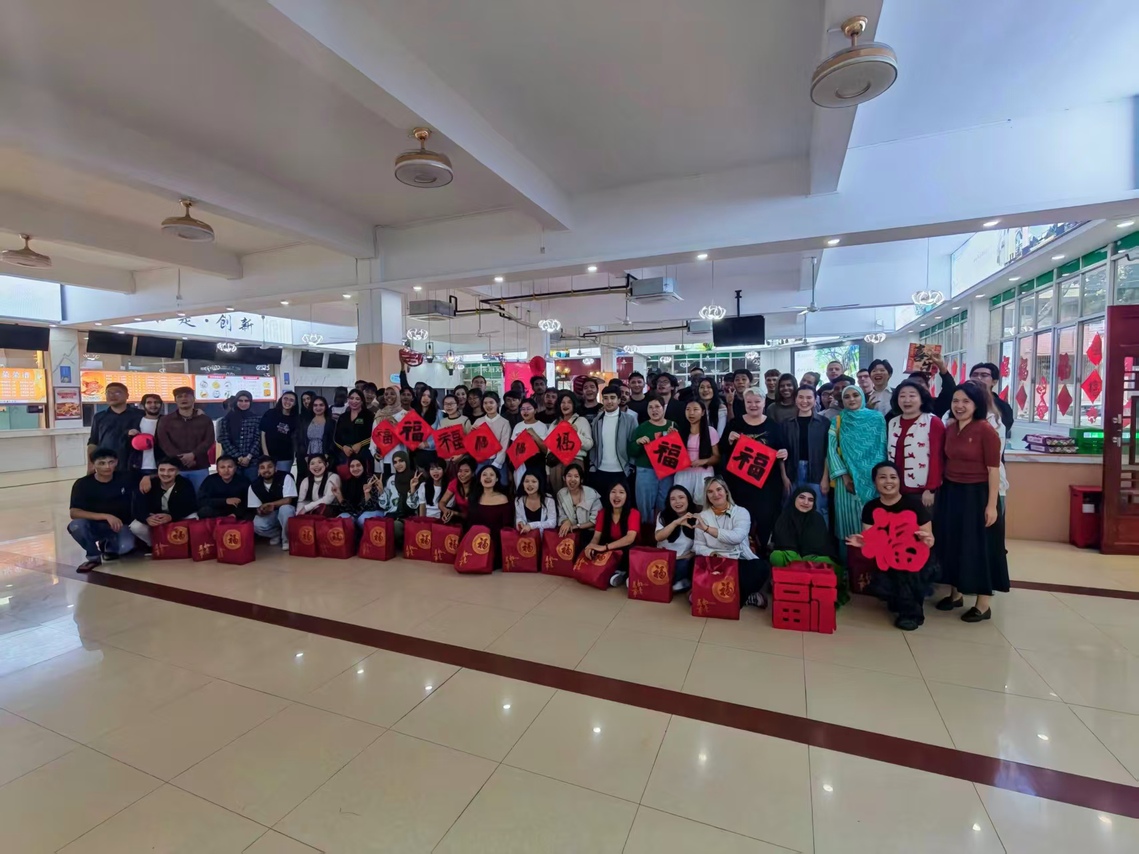 学院党委书记吴辰和院长耿娟为每位留学生送上精心准备的过年礼包,同学们感动不已,纷纷用中文表达感谢。