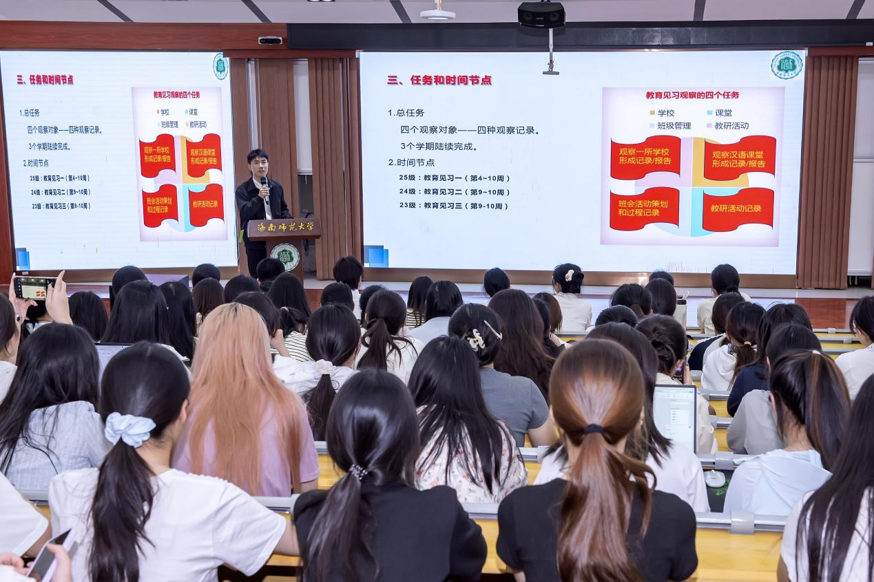 为切实保障见习顺利进行,3月19日,我院召开教育见习·研习动员大会。教研室主任曹方向老师为2025级学生全面介绍了本专业的见习目的、主要任务、见习材料填写方法和相关纪律要求,并就本专业在留学生课堂见习的具体安排和学生进行了互动交流。动员会后,曹老师指导班委完成了见习分组。